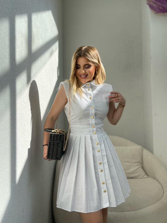 Fustan i shkurter me kopsa para. Ka qemer te bardhe ne bel dhe material te...