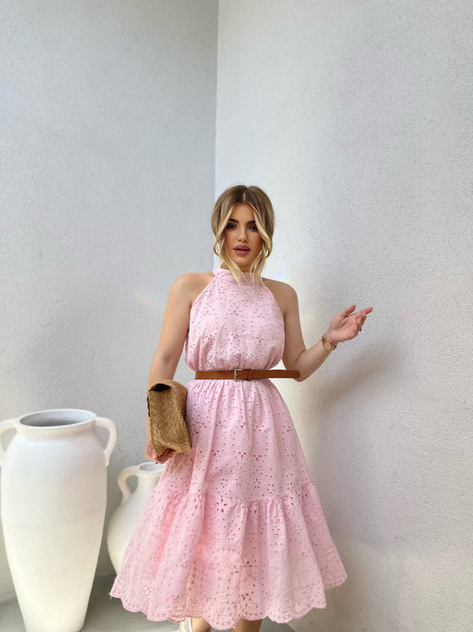 Fustan ne ngjyre roze te embel. Me llastik ne bel, gjatesia poshte gjurit. Mberthimi behet...