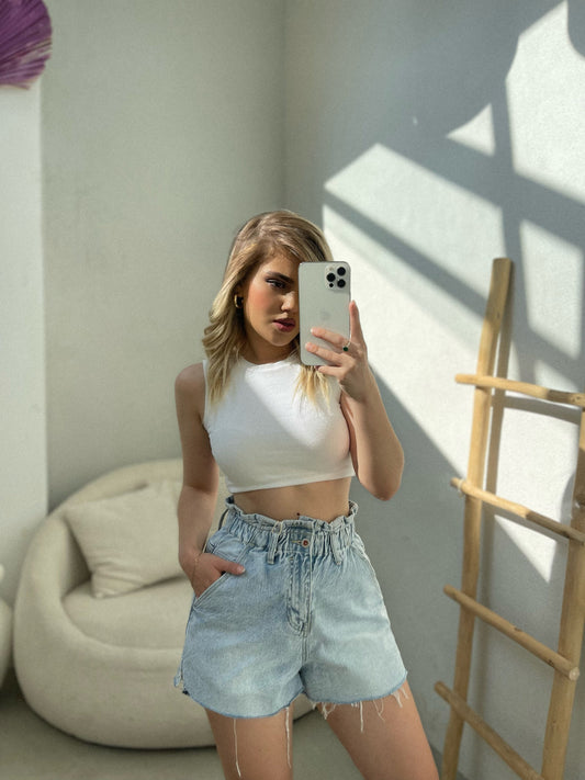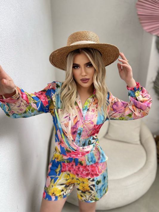 Kostum kemishe me lidhje ne bel dhe pantallona te shkurter. Kemisha vjen me kopsa para...