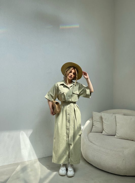 Jumpsuit me ngjyra i shkurter. Ka jake ne forme V-je dhe kopsa deri ne bel....
