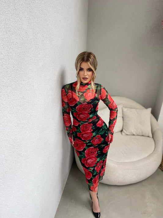Fustan i gjate me trendafila. Vjen me krahe te gjate tyl dhe ka material te...