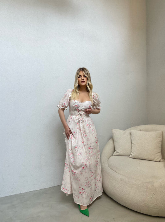 Fustan i gjate me lule me krahe te shkurter . Ka lidhje ne pjesen perpara...