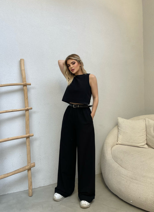 Kostum crop dhe pantallona te gjata. Cropi vjen me menge zhapone dhe pantallonat me llastik...