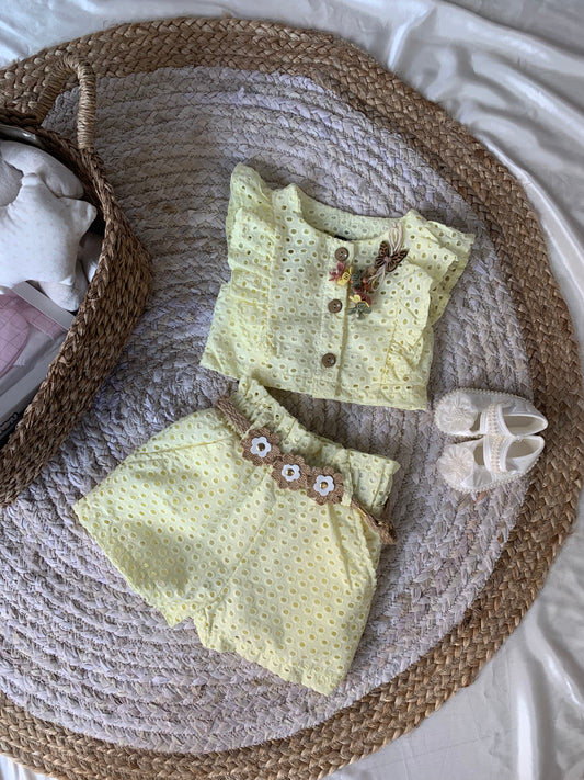 Set lino me kemishe dhe pantallona te shkurter. Kemisha vjen me lule dhe kopsa para....