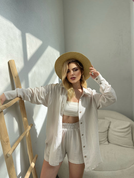 Set me kemishe me krahe te gjate dhe pantallona te shkurter. Kemisha vjen me kopsa...