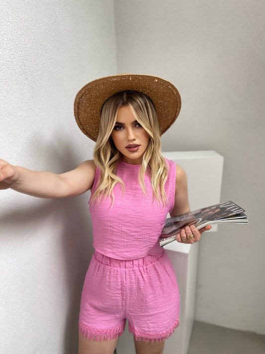 Set crop dhe pantallona te shkurter. Cropi eshte me krahe zhapone. Pantallonat vijne me llastik...