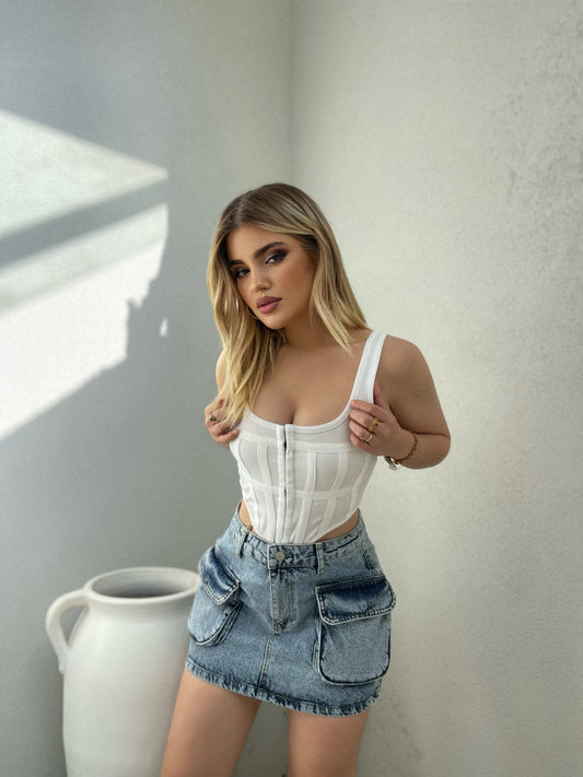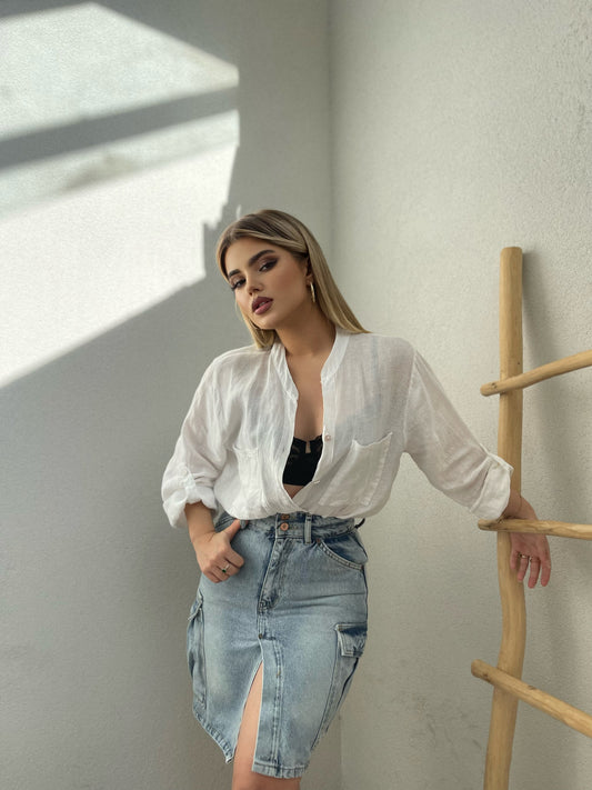 Fund i shkurter xhins me nje xhep ne pjesen perpara. Ka xhepa anash dhe mberthimi...