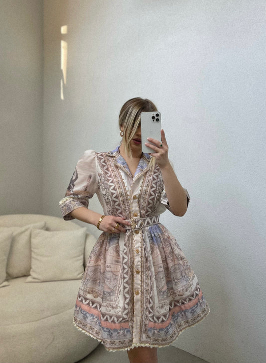 Fustan i gjate me menge te shkurtra. Me motive me ngjyra shume te embla. Me...