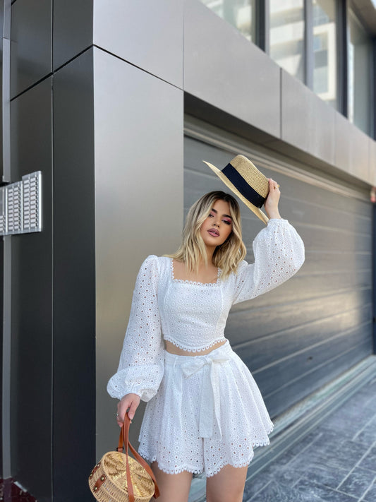 Set me bluze dhe pantallona te shkurter. Bluza vjen me krahe te gjate dhe jake...