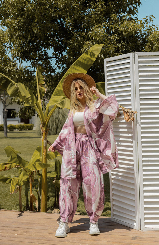 Kostum lino me kemishe te shkurter dhe pantallona te gjera. Ka material te plote dhe...