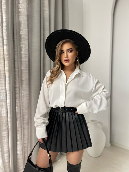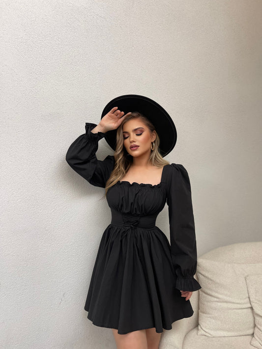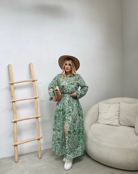 Fustan i shkurter me lidhje ne bel me krahe te gjate. Ka jake ne forme...