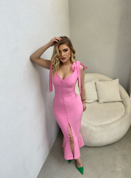 Fustan i gjate me te care perpara dhe llastik anash. Vjen ne forme busti dhe...