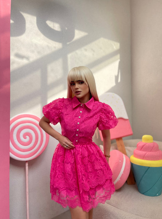 Fustan dantelle i shkurter . Vjen me krahe te gjate dhe mberthimi behet me ane...