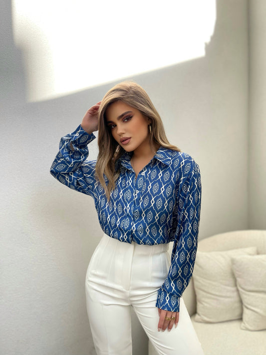 Kemishe me figura rombi ne ngjyren blu. Ka jake ne forme V-je dhe mberthimi behet...