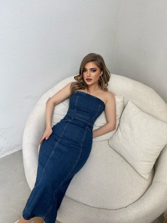 Fustan xhins bust. Ka nje te care ne pjesen mbrapa dhe mberthimi behet me ane...