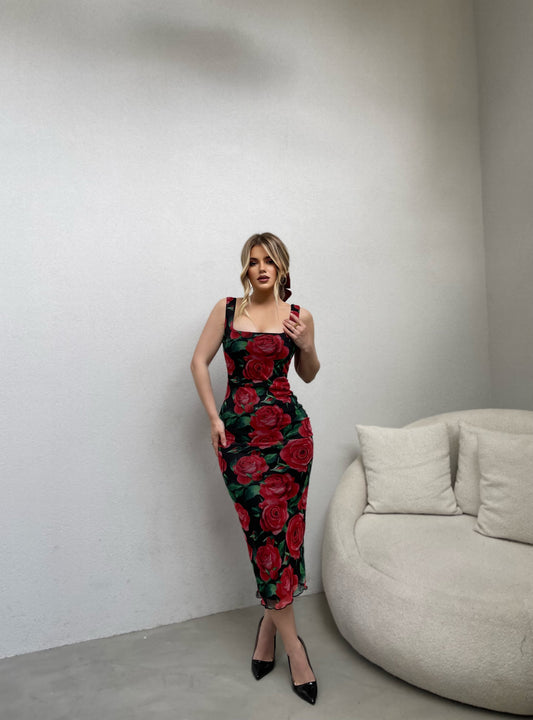 Fustan trecereksh me lule te kuqe. Vjen me rripa dhe me jake ne forme katrore....