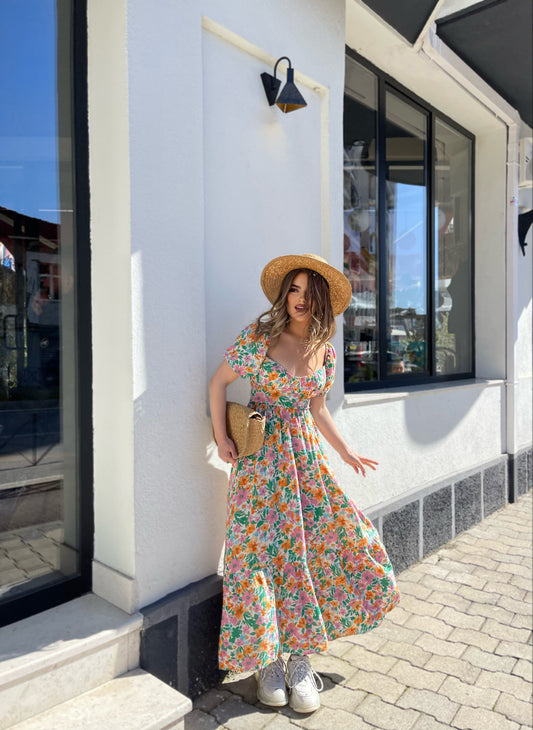 Fustan i gjate me lule me kurriz jashte. Vjen me krahe te shkurter dhe menge...