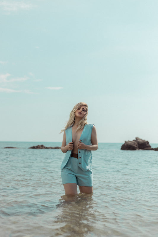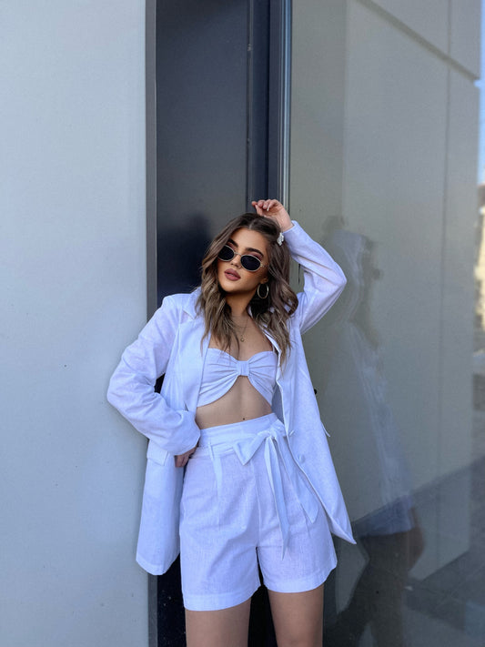 Kostum lino me 3 pjese. Vjen me xhakete , pantallona te shkurter dhe crop top....