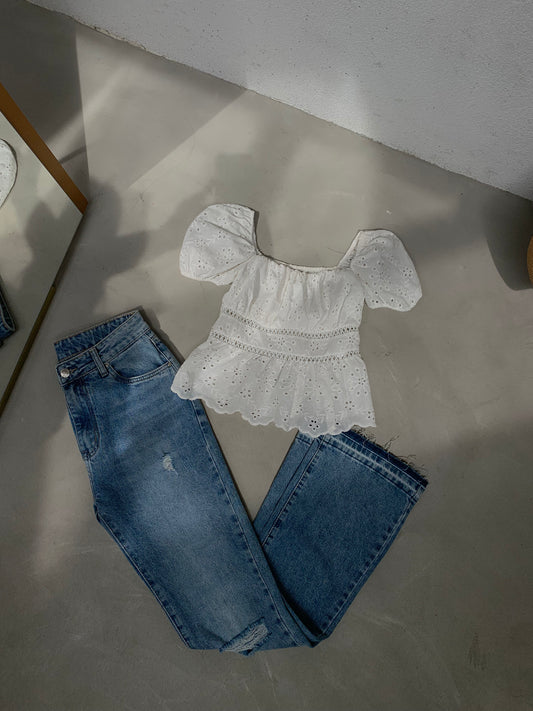 Fund i shkurter me gure ne forme lulesh. Ka te grisura ne pjesen perpara dhe...
