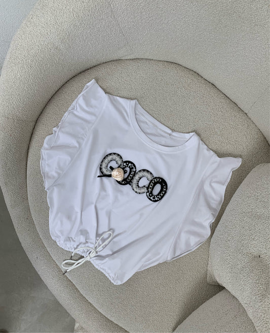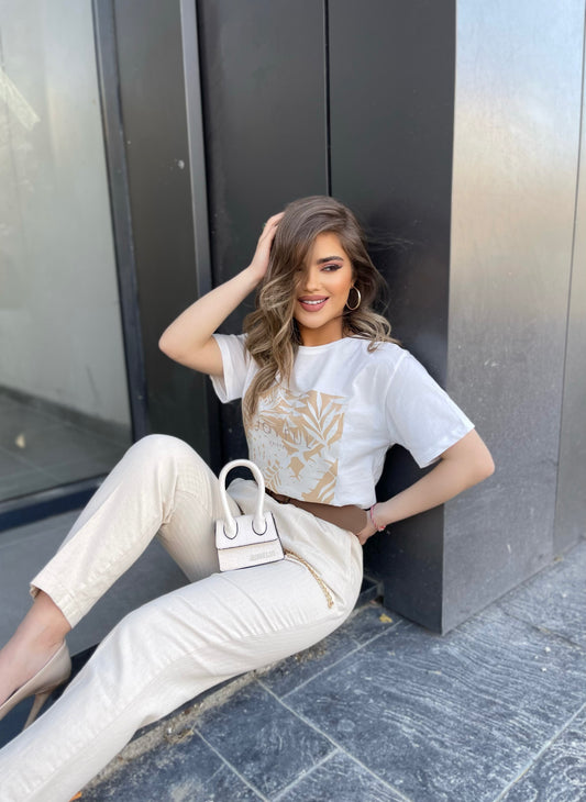 Bluze me krahe te shkurter dhe me figure ne forme gjetheje dhe shkrim ne pjesen...