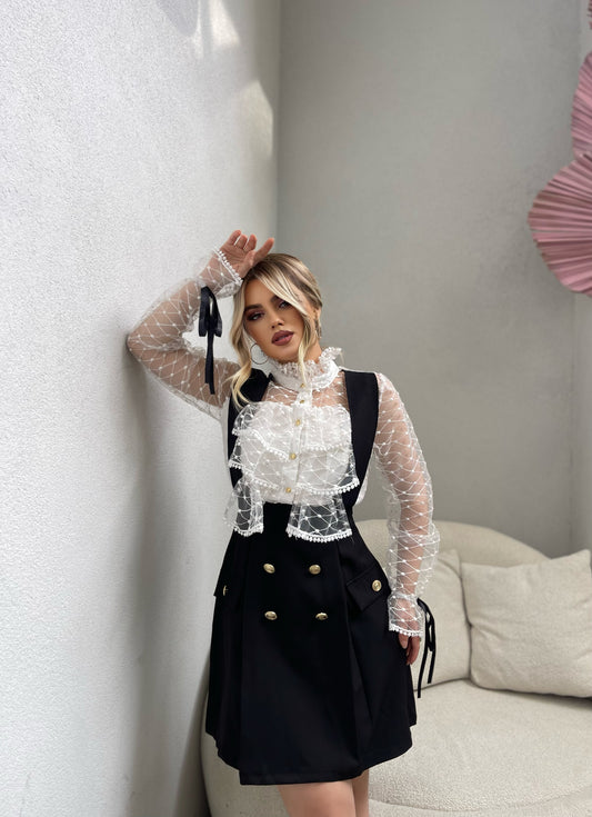 Fustan tyl me krahe te gjate dhe i shkurter. Vjen me paliceta siper. Mberthimi behet...