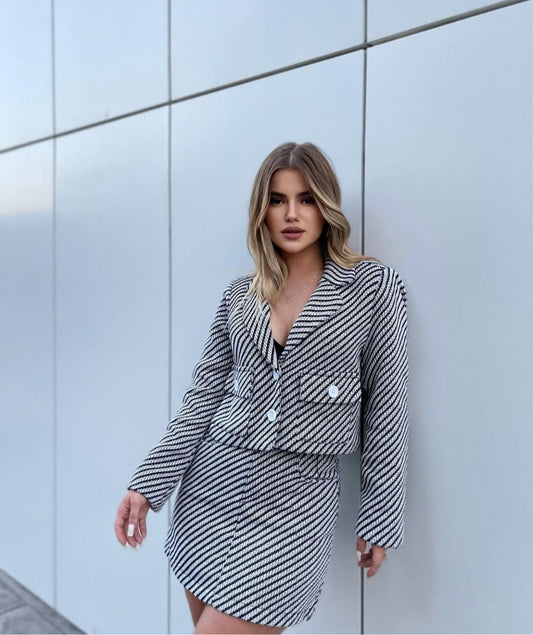 Kostum xhakete dhe fund i shkurter. Xhaketa ka kopsa para dhe xhepa te vegjel. Jaka...