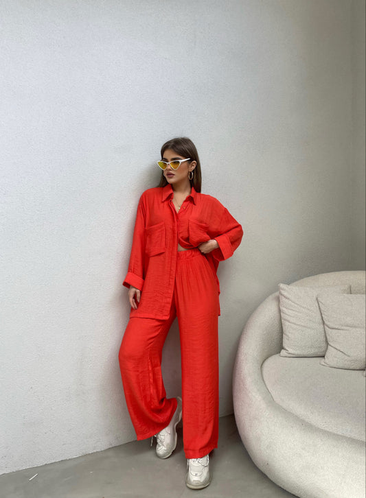 Kostum lino me pantallona te gjera te gjata. Me llastik ne pjesen e belit. Kemisha...