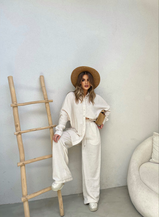 Set me kemishe dhe pantallona. Kemisha vjen me kopsa para dhe jake ne forme V-je....
