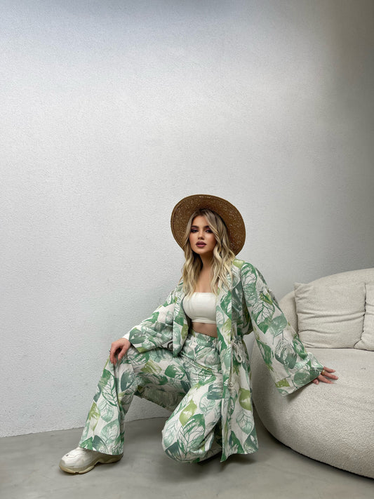 Set kimono dhe pantallona . Kimono ka rrip ne bel dhe material te plote. Jake...