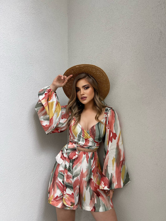 Set me crop dhe pantallona te shkurtra. Cropi vjen me krahe te gjate dhe lidhje....