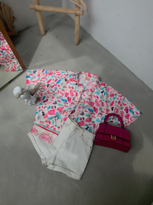 Kemishe me lule me krahe te shkurter. Ka jake ne forme V-je dhe kopsa para....