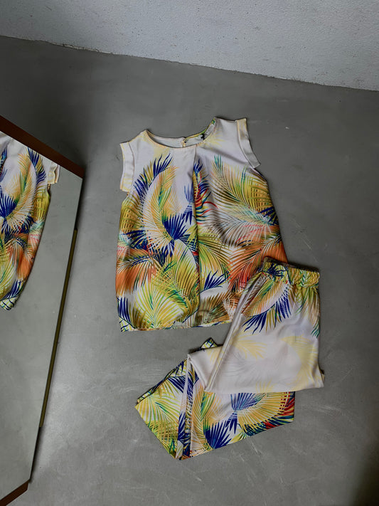 Kostum bluze dhe pantallona te gjera. Bluza ka jake ne forme rrethore dhe eshte stil...