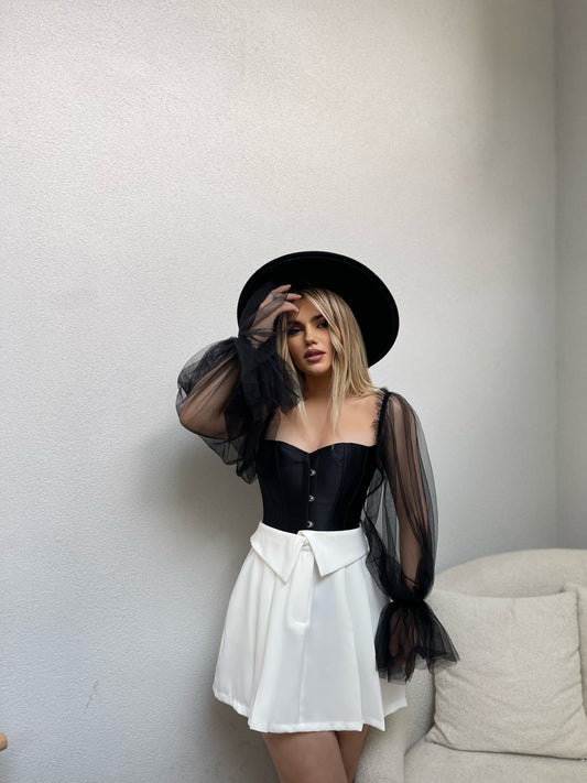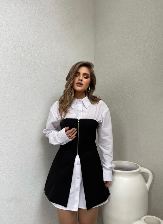 Fustan i zi i shkurter me kemishe te bardhe. Mberthimi behet me ane te zinxhirit...