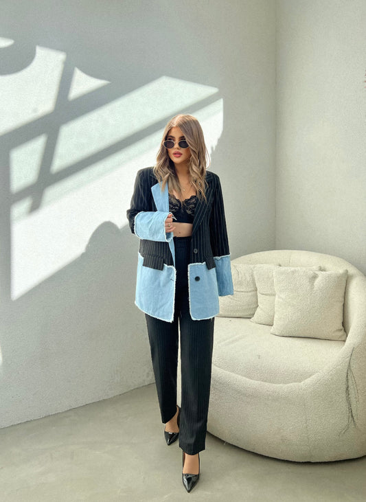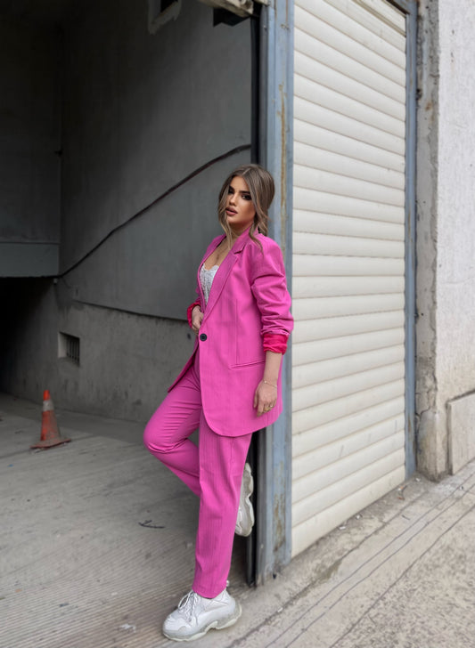 Kostum me xhakete dhe pantallona me viza. Xhaketa ka kopsa ne pjesen perpara dhe xhepa....