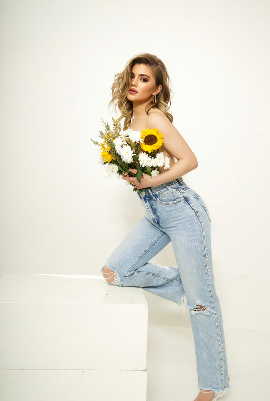 Bluze me viza me nje lule me gure ne pjesen perpara. Ka gjatesi normale dhe...