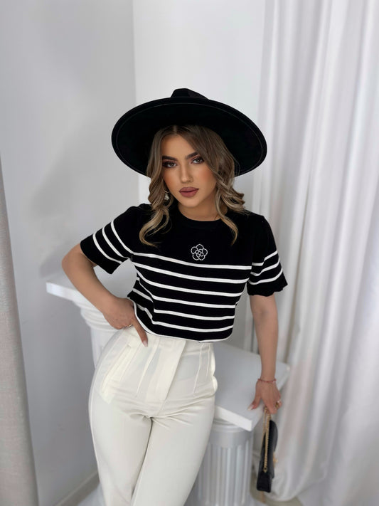 Bluze me krahe te shkurter e trikotuar. Vjen me jake me dantelle. Ka dy xhepa...