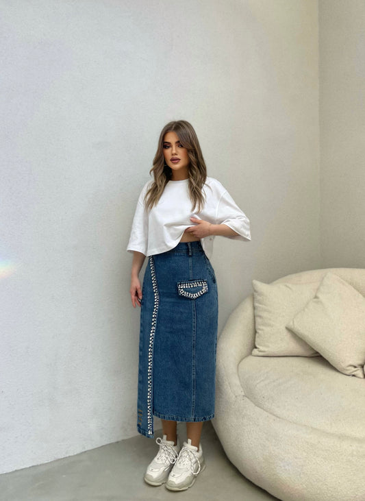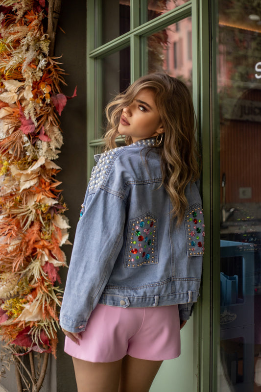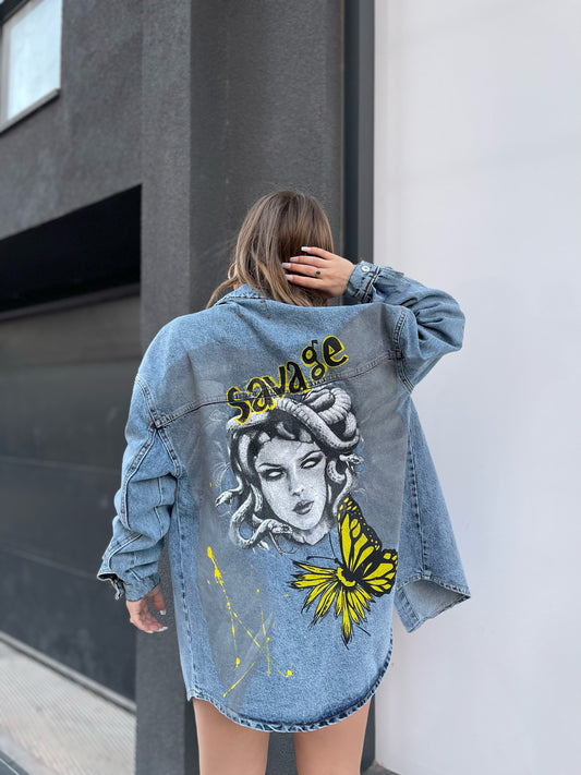 Xhakete xhins e gjate me figure vajze ne pjesen mbrapa. Jaka eshte ne forme rrethore....