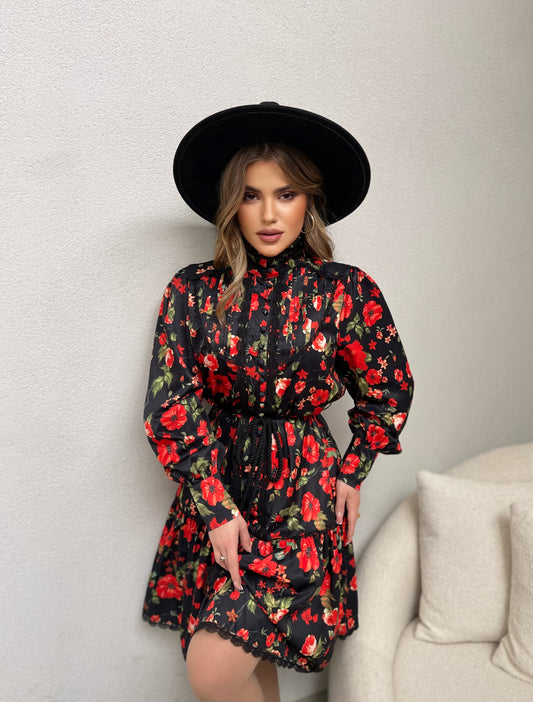 Fustan i shkurter me kule te kuqe me menge te gjata. Me rrip te holle....