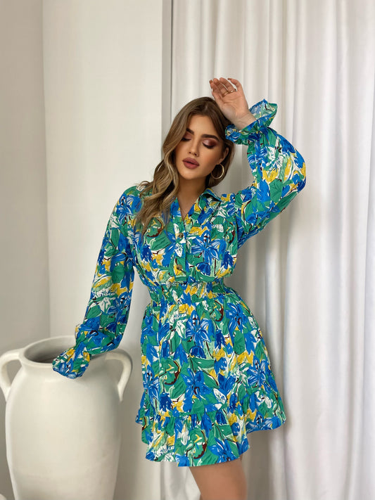 Fustan me lule me llastik ne pjesen e belit. Ka jake ne forme V-je ne...