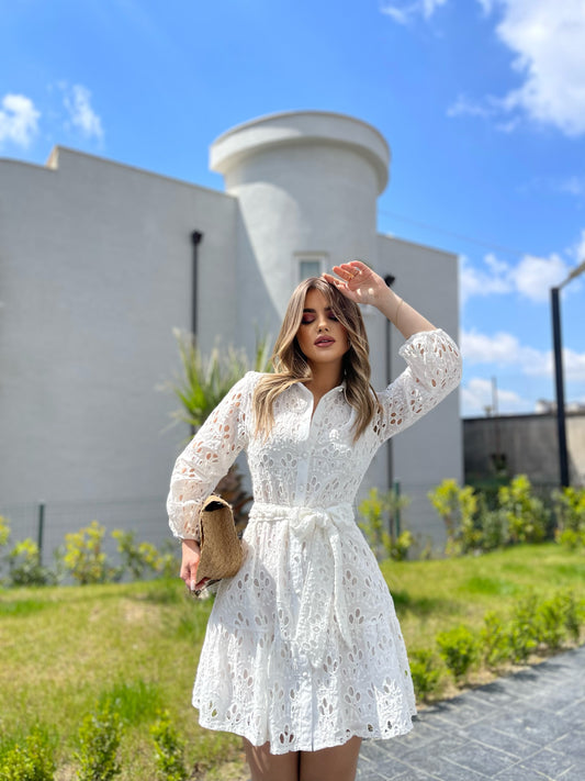 Jumpsuit i shkurter me dantelle perpara. Pjesa e siperme ka ngjyre te bardhe ndersa poshte...