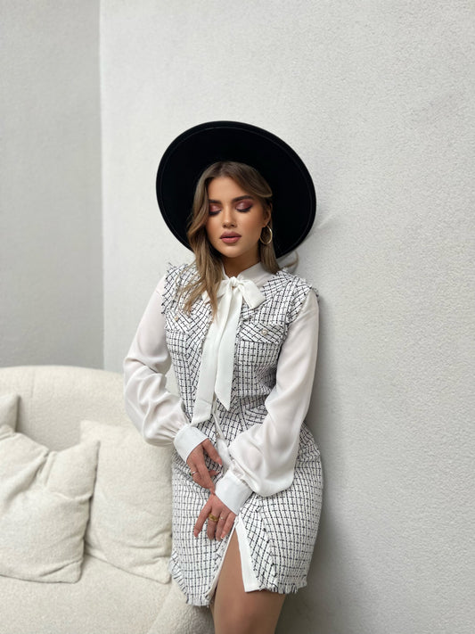 Fustan-sarafan me menge te gjata. Me menge material krem. Me dizenjo me kutia te vogla...