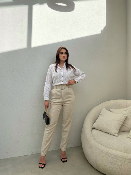 Pantallona lino me rrip ne pjesen e belit. Kane gjatesi normale dhe prerje te lirshme....