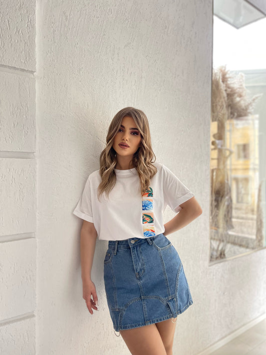 Bluze me krahe te shkurter e thjeshte me figura te vogla ne pjesen perpara. Ka...