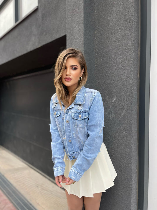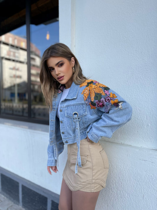 Xhakete e shkurter xhins me lule me temina ne pjesen perpara. Ka xhepa me lidhese....