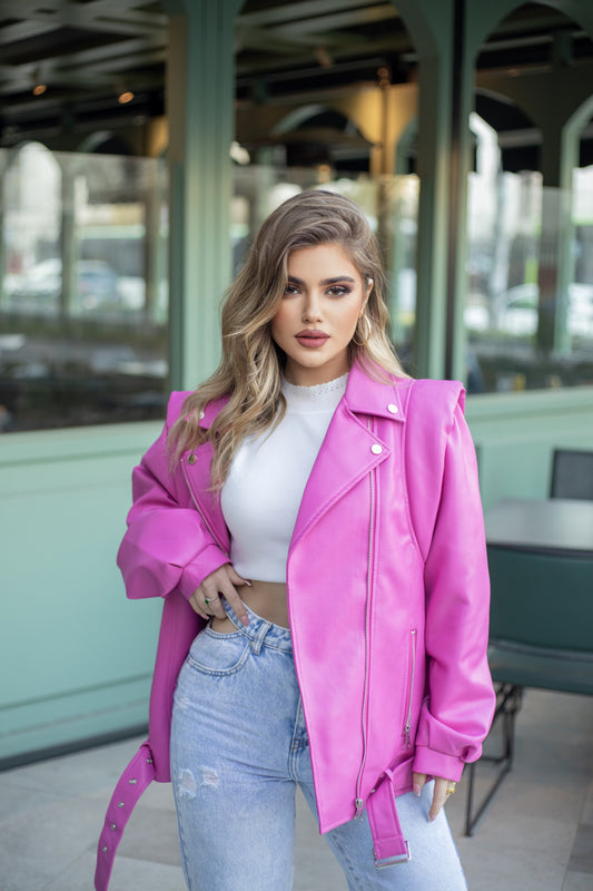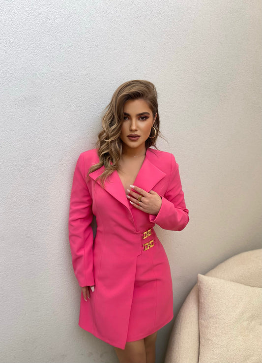 Fustan-xhakete roze me zinxhir ne pjesen e belit. Ka jake ne forme V-je dhe mberthimi...