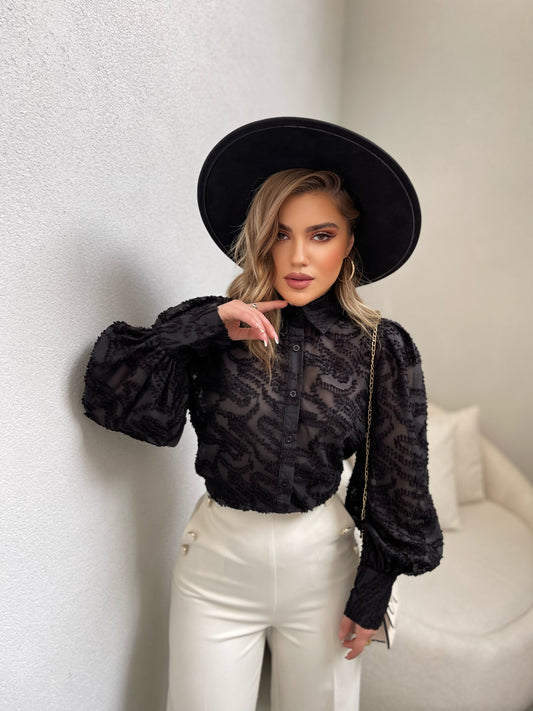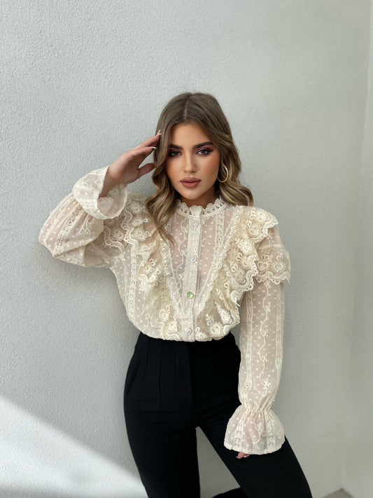 Bluze me mnege te gjata me jake ne form V-je me gure dhe fjongo ne...