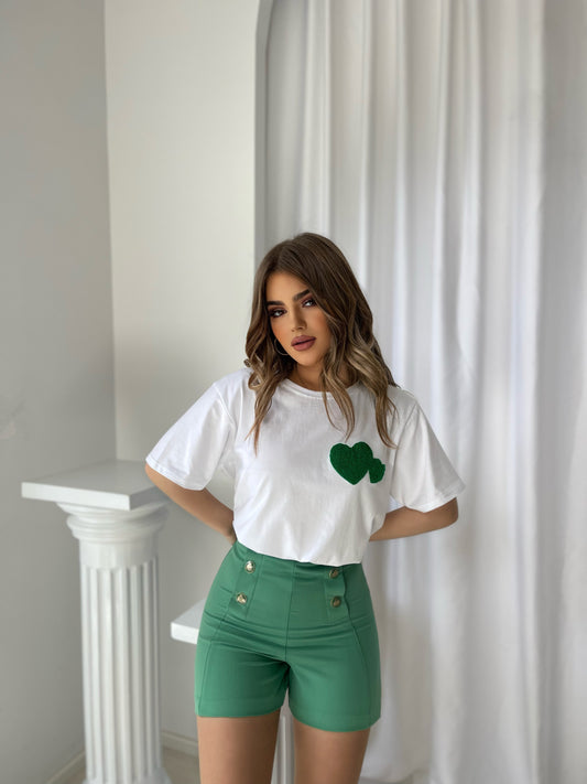 Bluze me krahe te shkurter me zemer perpara. Ka jake ne forme rrethore. Gjatesi normale...