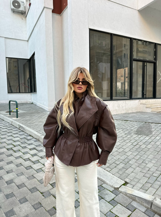 Kostum klasik me xhakete te shkurter dhe pantallona me prerje te lirshme.Xhaketa ka menge te...