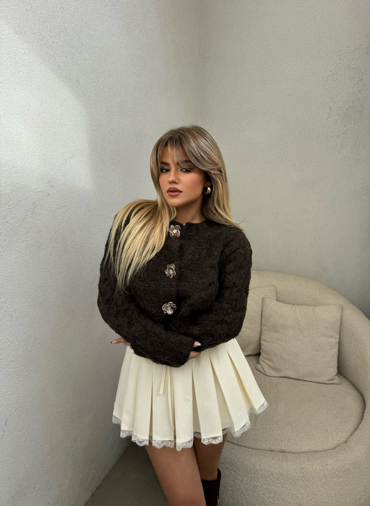 Pulover me detaje fjongosh dhe kopsa. Vjen ne dy ngjyra bezhe dhe kafe. Material i...