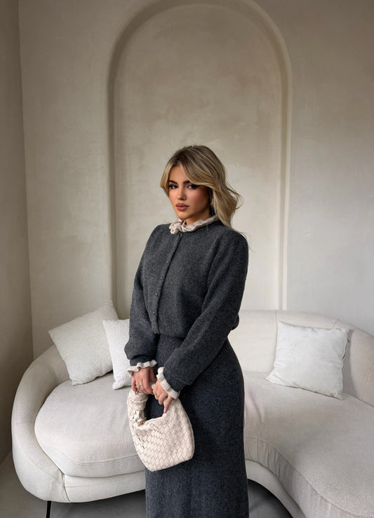 Set elegant me dy pjesë në ngjyrë gri të errët, i përbërë nga fund i...